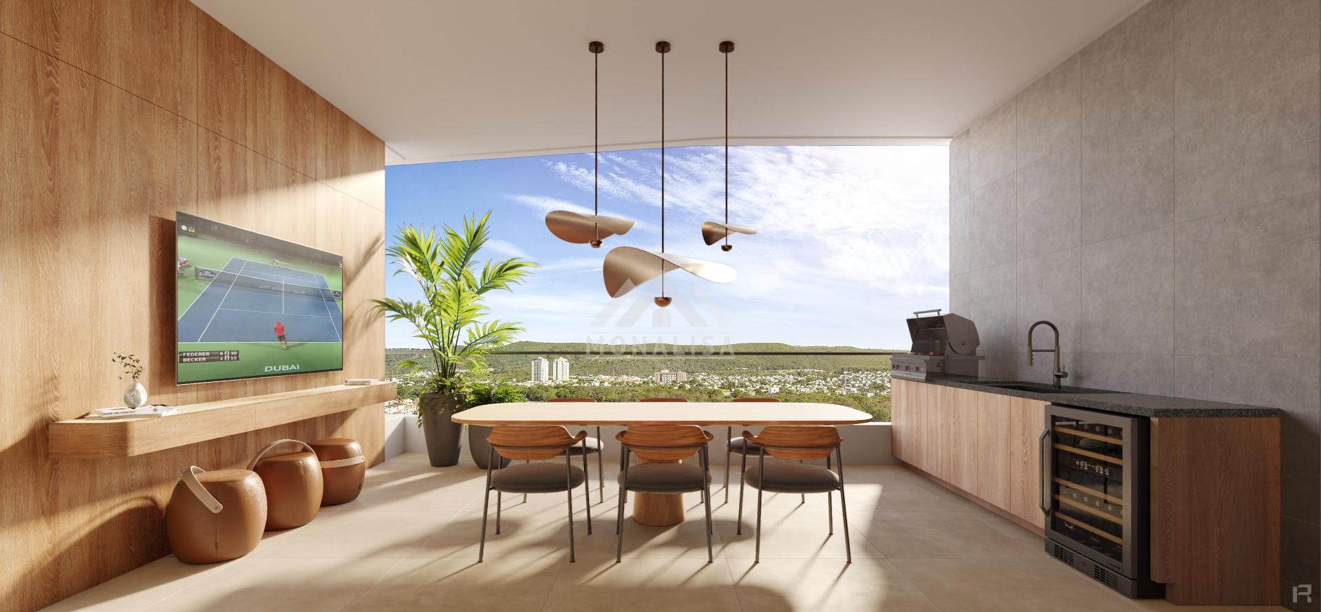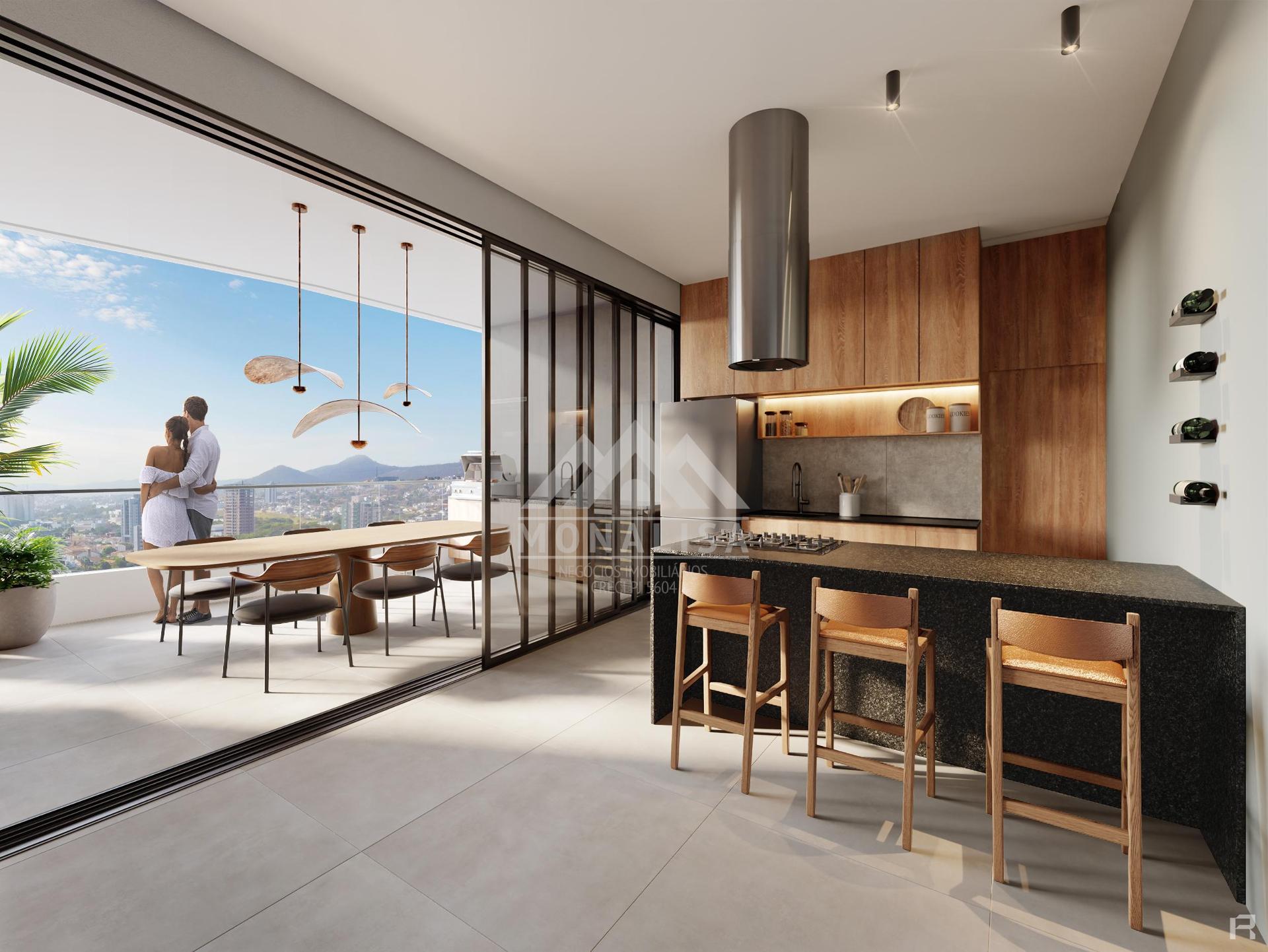 plantas amplas, inclusive com closet e uma varanda gourmet sem igual, que comporta mesa de jantar, churrasqueira e adega ou cervejeira, com vista deslumbrante da serra.